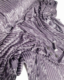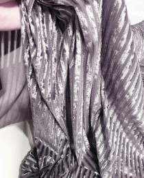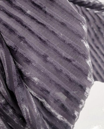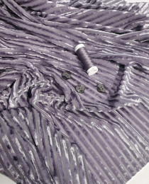 Ткань выполнена в виде бархатных полосок на полупрозрачном полотне. Кажется, что бархат "светит", но на самом деле это лишь легкая иллюзия прозрачности, что придает вещи ещё большей тайны и шарма.