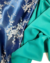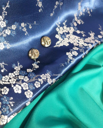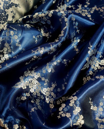Наша богатая коллекция китайских набивных атласных жаккардов: сияющий синий искусственный шёлк с потрясающей вышивкой – серебрящиеся инеем ветви сакуры. Смотрится абсолютно кутюрно, роскошно, богато. На "выходной" жакет для особых случаев.