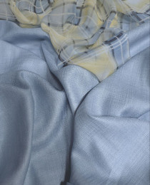 Костюмная ткань небесно-голубого цвета в выработке, полностью имитирующей натуральный костюмный шёлк, или полированный лён с шёлком. Эта ткань ввела нас всех в стопор, настолько она красива и выгдядит на миллион. Мы не могли поверить, "до чего дошёл прогресс" в производстве бюджетных аналогов, и даже жгли полотно, перепроверяя себя.