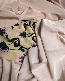 Ткань словно сошла с подиумных показов Armani или Carolina Herrera. Дорогая и кутюристая на вид, роскошная по пластике, скользящая, мерцающая, с потрясающей фактурой шёлка-чесучи.
