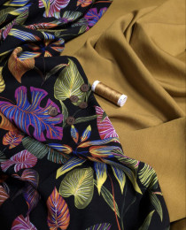 Добавляем потрясающую по-выработке поливискозу цвета латунного золота. Очень красивая и дизайнерская ткань: она напоминает песочные дюны и барханы, накалённые солнцем. Причудливая волнистая гладь, похожая на муслиновую и сирсакерную фактуру одновременно. Плюс, шелковистое сияние и скользяще-холодящая тактильность.