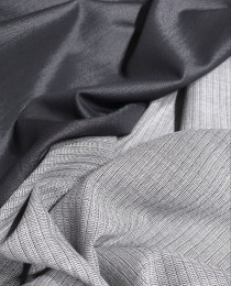 Ткань – "пушкабомба"! Визуально похожа на джинс-металлик. Чёрно-графитовая основа пронизана серебристыми нитями. Полотно всё переливается, но, при этом, это не "пафосная" блестящая ткань, а шиковая, богемная и расслабленная.